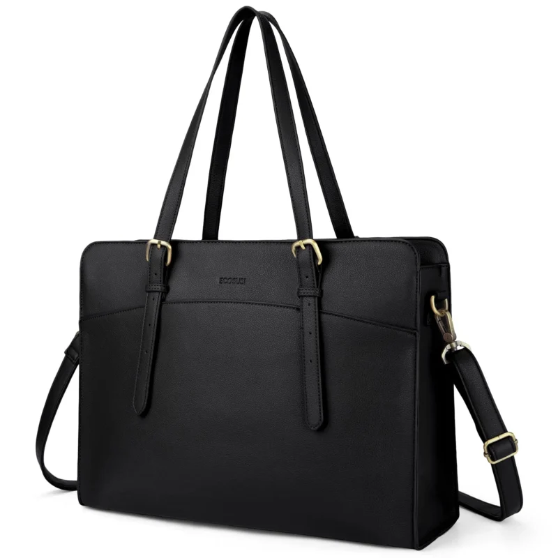 ECOSUSI Leather Laptop Tote Bag for Women 15.6 Inch Computer Briefcase Waterproof Handbag Shoulder Bag Purse for Tablet Work Office Business College Daily Travel, Black