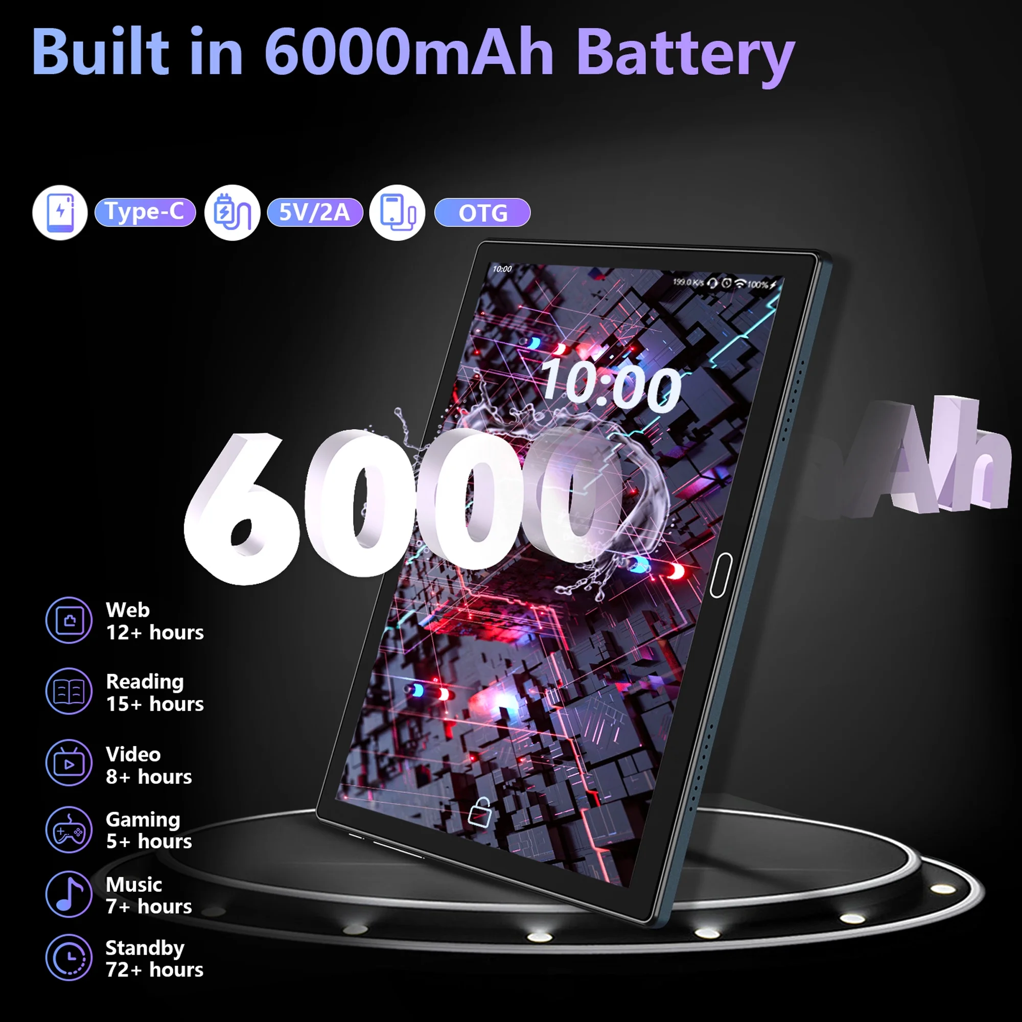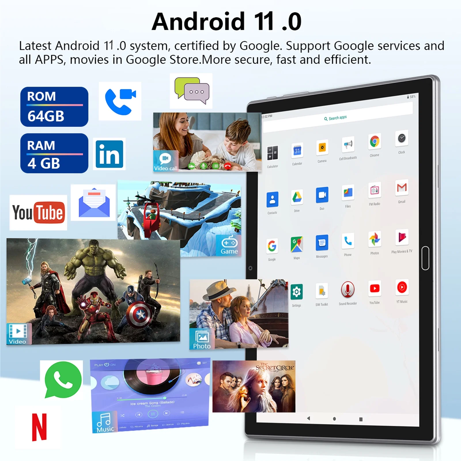 Built in Android 11.0’s original ecosystem Tablet K118,with a G+G large glass screen processing,10.0-inch,1.6GHz Octa-Core processor,Supporting 1280 * 800 pixels,Support 2.4G WiFi connectivity to make video calls.4GB running memory, and 64GB storage space.The memory can be expanded to 128GB, meeting daily work and learning needs with large capacity.6000 mAh Polymer Lithium Ion Battery,Not only large capacity and durable, but also safer than standard batteries.High endurance,a charge can last 8 hours of use.5.0+13.0MP Dual Cameras, making it easy to record exciting moments.We can also download more apps from the Google Play Store, such as YouTube, Netflix, Hulu, etc.