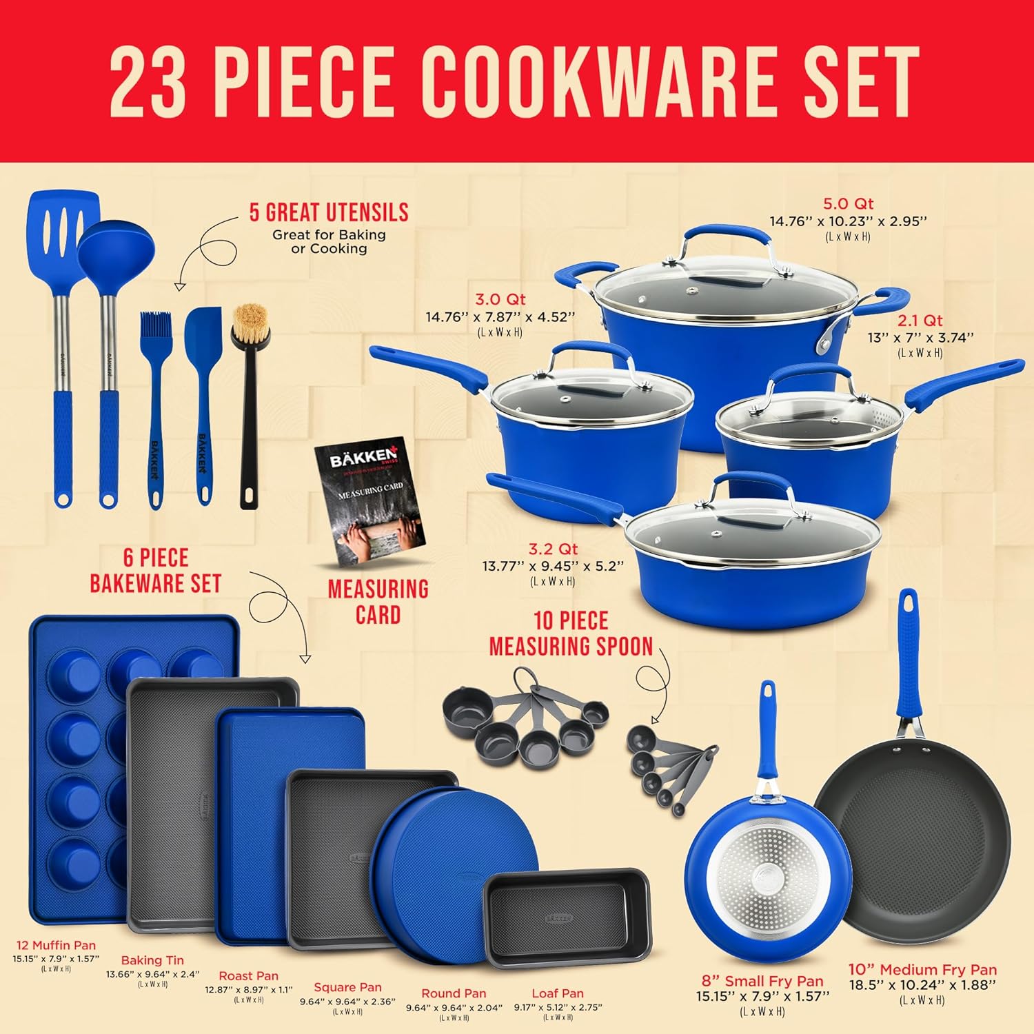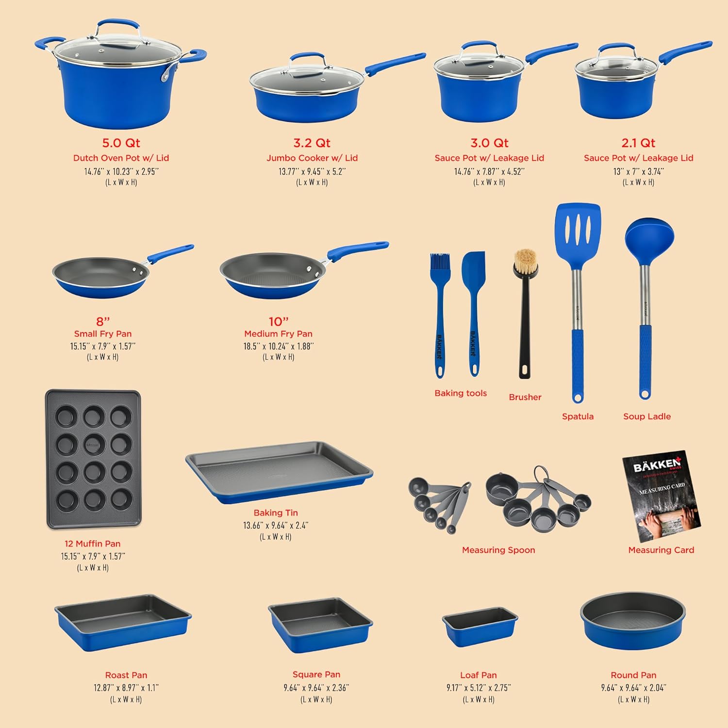Be the first to review “Cookware Set – 23 Piece –Blue Multi-Sized Cooking Pots with Lids, Skillet Fry Pans and Bakeware – Reinforced Pressed Aluminum Metal – Suitable for Gas, Electric, Ceramic and Induction by BAKKEN Swiss” Cancel reply