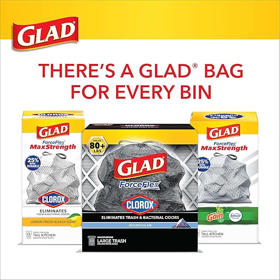 • FORCEFLEX TRASH BAGS: Glad’s trusted ForceFlex technology allows the garbage bag to stretch and expand over heavy loads with sharp edges, delivering durable strength; packaging may vary