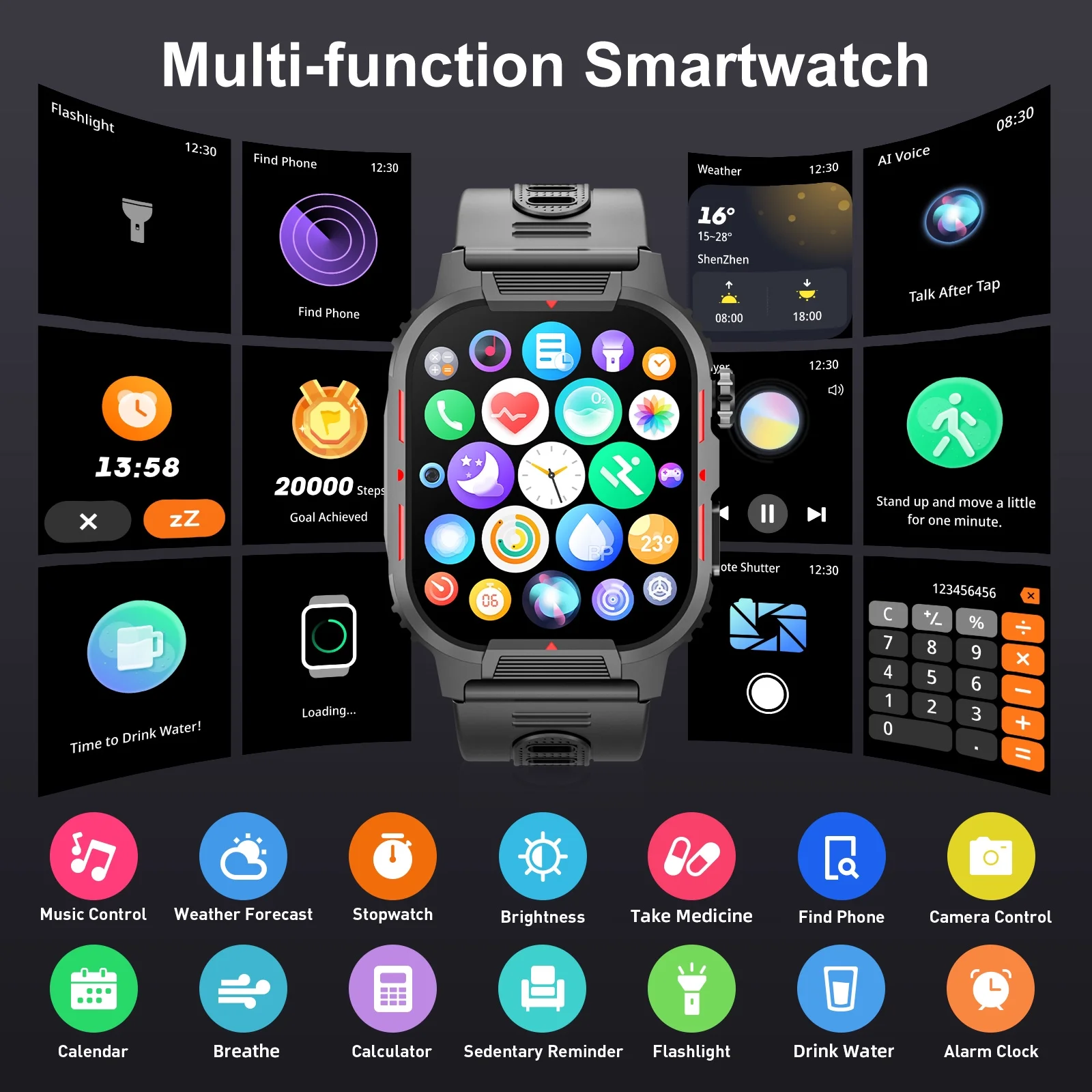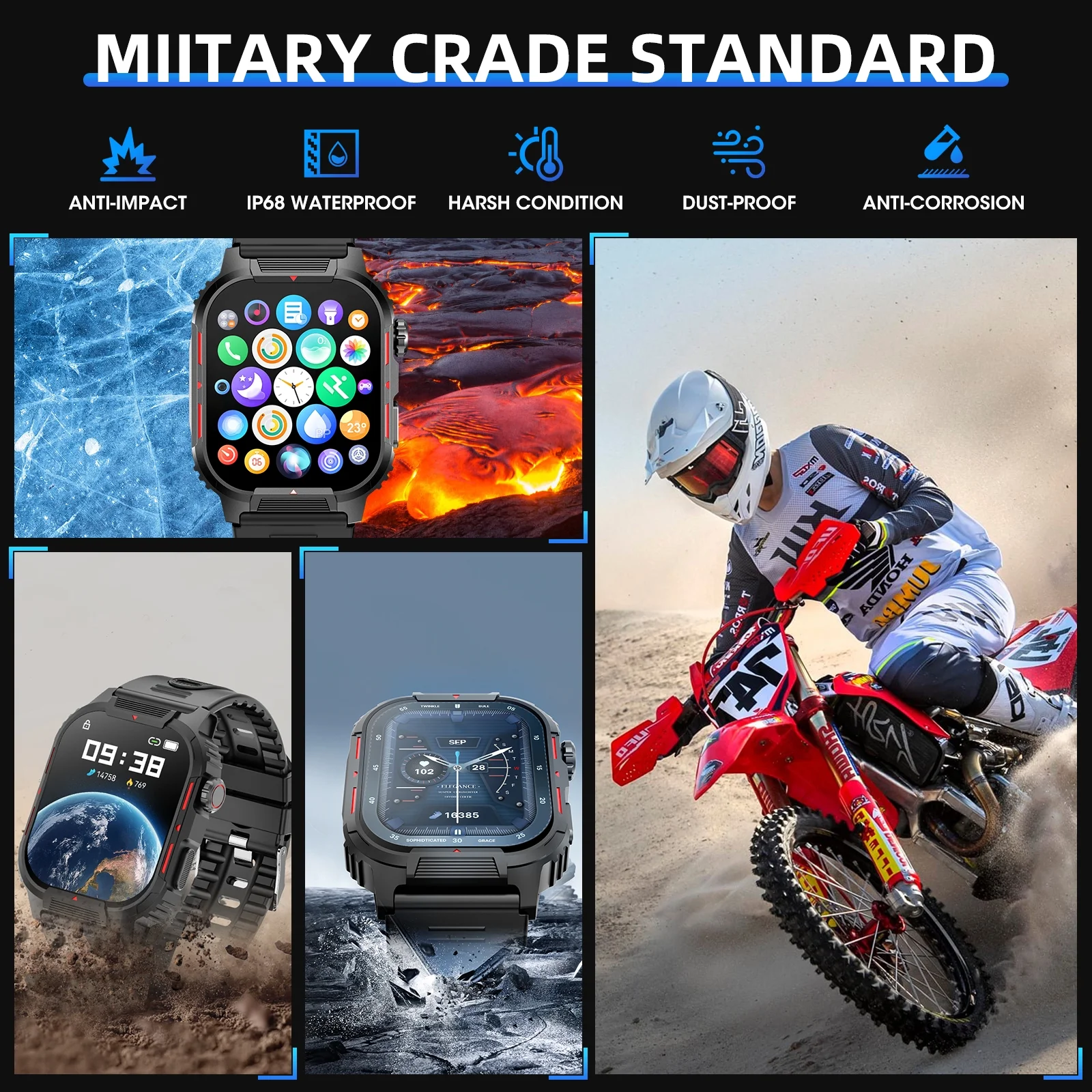 - This men’s military smart watch is made of special composite materials and metal casing, making it sturdy and durable. Mingdaln smartwatches passed various durability tests, including drilling, crushing, exposure to hot steam, salt spray and liquid contamination. Additionally, it continues to operate even at very low temperatures. This men’s smart watch is equipped with a 5.0 Bluetooth chip, allowing you to make and receive calls, receive mobile text messages, control music playback, and even take photos with your phone’s camera. With this watch, you can stay hands-free and stay connected while socializing and entertaining. You’ll never miss important information again, and you don’t have to always take out your phone. Wireless voice calling rugged smart watch features include social media message notifications and previews, AI voice assistant, alarm clock, calculator, breathing exercises, calorie counting, greeting cards, sedentary reminder, stopwatch, flip wrist light, Remote camera, music control, weather forecast, multi-sport modes The military tactical sports smart watch has a 350mAh battery capacity, with a standby time of up to 30 days and a normal working time of up to 7-10 days. 2.02-inch HD touch screen. Adjustable to 5 brightness levels so you can see watch content in strong outdoor light. It has rich built-in watch faces and nearly a hundred UIs in the APP store for you to choose from. Customize your personal user interface to show your personality. Mingdaln military smart watch, suitable as an anniversary or birthday gift for your lover, family and friends. When you receive the smart watch, if you have any problems, such as watch accessories, quality problems, operating problems, charging problems, etc., please contact us and we will provide you with a solution within 24 hours. The smart watch is compatible with Android 4.4 and above and ios8.0 and above.