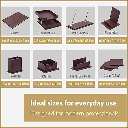 - We are offering you the opportunity to find the office accessories that you need, conceived by our finest leather artisans. Made with authentic leather and in a unique palette of colors, you will definitely add a distinct touch of class to your office décor. Our leather office sets are also well coveted among professionals who use them in conference or meeting rooms.