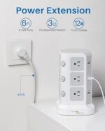 Power Strip Tower by KOOSLA, [15A 1500J] Surge Protector – 12 AC Multiple Outlets and 6 USB Ports, Flat Plug 14 AWG Heavy-Duty Extension Cord 6.5ft, Home Office Supplies, Dorm Room Essentials White